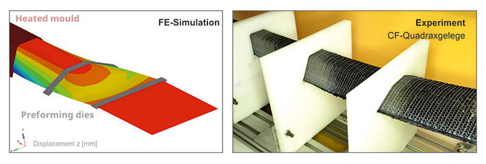 Abb. 2 zeigt exemplarisch den Vergleich von numerisch und experimentell gewonnenen Ergebnissen für die Zuführung von CF-Multiaxialgelegen. Die hohe Nichtlinearität von Materialverhalten, Geometrie und Randbedingungen erfordert besonderes Know-how zur FE-Simulation. Ferner sind meist spezielle Versuche zur mechanischen Werkstoffcharakterisierung der (getränkten) Textilien erforderlich. Die Bandbreite bereits realisierter Profilquerschnitte mit Textilverstärkung erstreckt sich von geschlossenen Hutprofilen bis hin zu komplexen Mehrkammerprofilen mit Wandstärken von mehr als