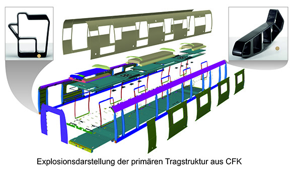 angeordnet sind und maßgeblich die Längskräfte und Biegelasten aufnehmen (Abb. 4). Diese Profile sind in der Seitenwand über die Türpfosten und dazwischenliegende CFK-Sandwichstrukturen miteinander verbunden. Die Masseeinsparung gegenüber dem metallischen Wagenkasten liegt bei etwa 30 Prozent.