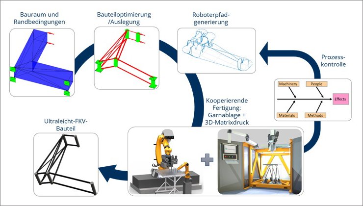 Das Projekt adressiert die Herstellung von lastpfad- und konturgerechten 3D-FKV mit maximalem Leichtbaupotenzial. Im Fokus stehen sowohl die Auslegemethodik für die Komponenten als auch die Fertigungstechnologie mittels robust und effizient kooperierenden Robotersysteme. Die hybride Fertigungstechnologie vereint die robotergestützte selektive Deposition von Endlosfasern und die Generierung der Matrix mittels 3D-Druck. Schwerpunkte des Vorhabens sind: