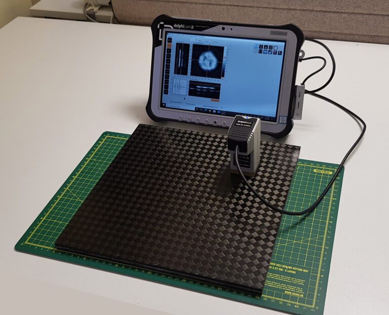 For aerostructures it is crucial to inspect built-in sandwich structures for flaws. Thus, Dolphitech, reknowned provider of NDT products and services, made special foam core panels. They are bonded between two spread-tow carbon fiber reinforced polymer (CFRP) outer laminates and contain a range of embedded flaws at different depths. With the dolphicam2 and the newest Freya software version, these features were clearly detected and presented.
