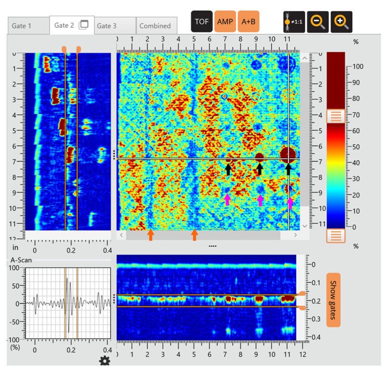 This was all achieved with a standard pulse echo setup without the need for any through-transmission technique. Moreover, the Freya software version introduces the ability to quickly toggle between and view multiple C-scans, which streamlines the analysis of multi-layered samples and speeds up the overall inspection time.