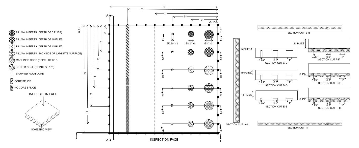 The foam core is Rohacell 51 IG, which is a commercial grade, closed cell expanded polymethacrylimide (PMI) used for lightweight sandwich construction. The core is 0.23″ thick, the laminate on the inspection side is 0.18″, and on the back face is 0.08″. The embedded features include both flaws and manufacturing processes.
