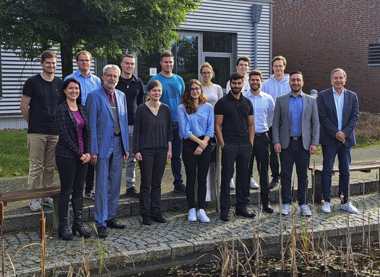 Katharina Lechler (Composites United; erste Reihe links) mit Prof. Dr. Wilm Unckenbold (PFH Hansecampus Stade; erste Reihe zweiter v.l.) und Dr. Gunnar Merz (Composites United; erste Reihe rechts) begrüßten die Studierenden des Trainee-Programms 2022/23 in Stade.