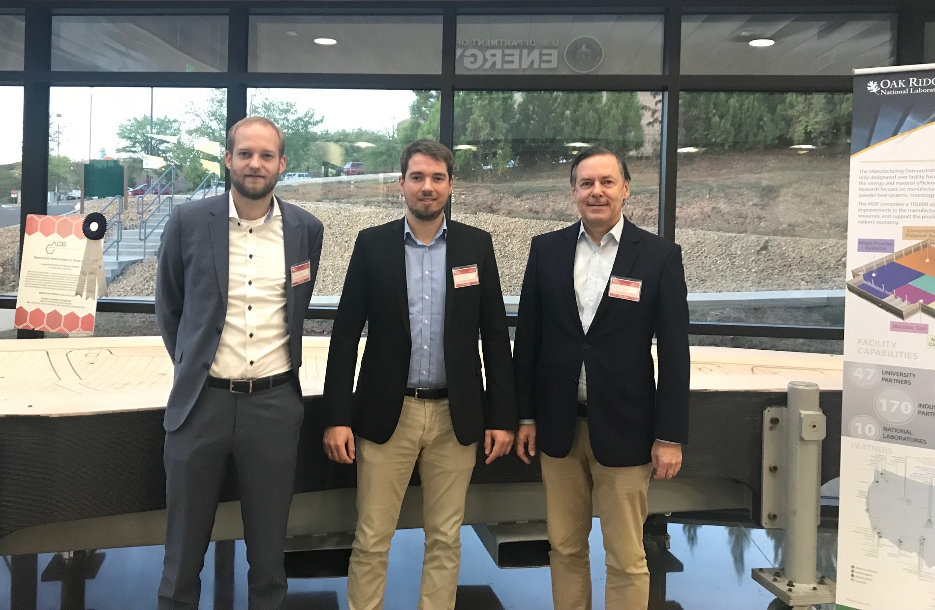 Bildunterschrift: CU-Team in Oak Ridge: Sven Blanck, Dr. Bastian Brenken, Dr. Gunnar Merz vertreten den deutschen Leichtbau bei der Transatlantic Cluster Roadshow (v.l.n.r.) (© CUeV)