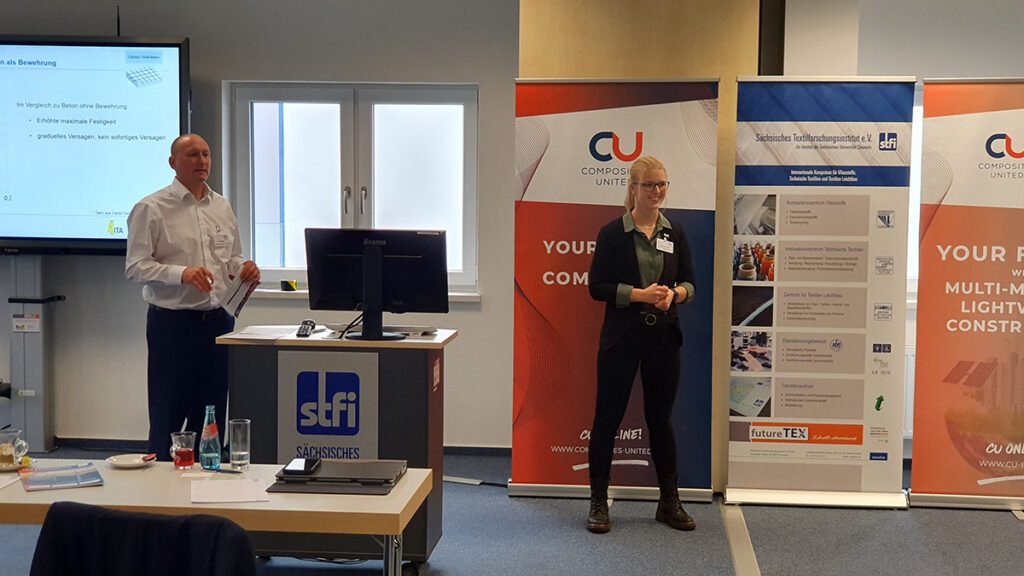 Beim CU Innovation Day „Second Life – Wiederverwendung von Composites im Bau- und Energiesektor“ trafen sich über 50 TeilnehmerInnen rund um die CU Bau-AG „Nachhaltigkeit/ Gesundheit/ Kreislaufwirtschaft“ und die CU-AG „rCF-Anwendungen“ im Dezember am Sächsischen Textilforschungsinstitut e. V.