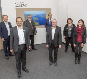 Zum Start des neuen Projektes trafen sich die Clusterverantwortlichen am Donnerstag im Kreishaus (von links): Marcus Hübner (hochschule 21), Erster Kreisrat Thorsten Heinze, Professor Thorsten Hermes (hochschule 21), Dr. Gunnar Merz (Composites United e.V.), Professor Ingo Hadrych (hochschule 21), Gönke Lengsfeld (Bildungsbüro Landkreis Stade) und Katharina Lechler (Composites United e.V.). (© Landkreis Stade/Christian Schmidt)