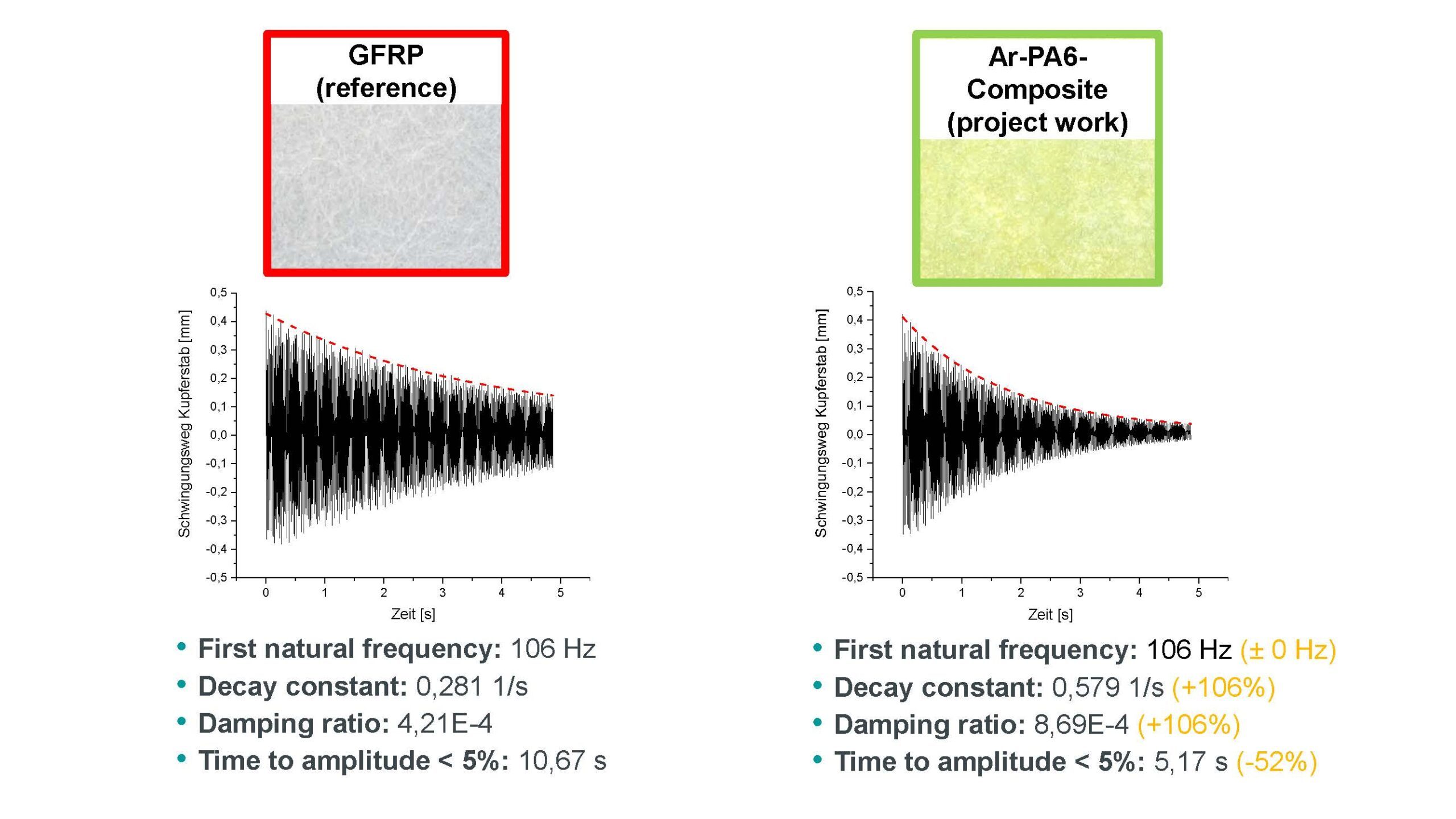 Im Vergleich zur Bauteilvariante aus Primärkohlenstofffasern im RTM-Verfahren ist bei gleicher Leistung ein um 14 % reduziertes CO2-Äquivalent möglich. Bei Verwendung des Prepreg-Verfahrens unter Nutzung eines Bioharzsystems zeigen die Berechnungen sogar ein Potenzial zur Reduzierung des CO2-Äquivalents
