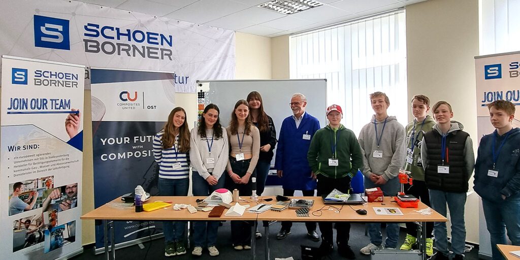 Das Cluster CU Ost des Composites United (CU) unterstützte diese Veranstaltung und stellte die CU-Experimentierkoffer bereit, welche besonders großen Anklang bei den jungen Menschen fanden. Die Koffer enthalten Materialien, Vorrichtungen, Anleitungen, Sicherheitshinweise und natürlich Schutzausrüstungen für die mobile Demonstration von Faserverbund-Technologien. Kunststoff-Ingenieur Dr. Christoph Irmler führte damit verschiedene Verfahren vor, angefangen von der additiven Fertigung über das Thermoformen und Heizpressen bis hin zum Laminieren. Dabei erläuterte er den Schülerinnen und Schülern die Wichtigkeit von Kunststoffen für unser tägliches Leben und warum jeder Werkstoff seine Daseinsberechtigung hat.
