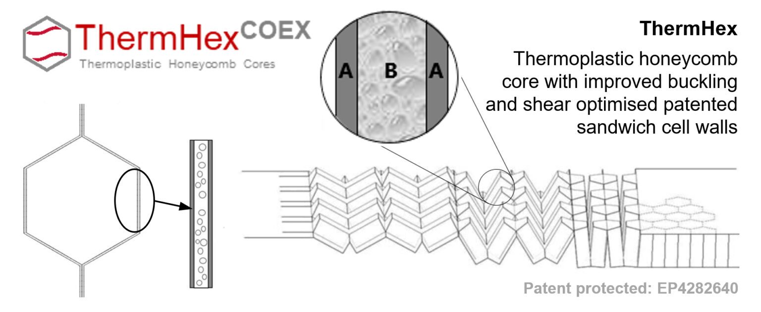Eine weitere Innovation, die ThermHex Waben und EconCore auf der JEC 2025 in Paris vorgestellt haben, ist der ThermHexCOEX Wabenkern. Diese Entwicklung basiert auf der Extrusion des thermoplastischen Polymers zu einer mehrschichtigen Flachfolie und der anschließenden Thermoformung zu Wabenkernen. Die strukturierte Zellwand besteht aus zwei festen Außenschichten und einer Innenschicht mit geringerer Dichte.